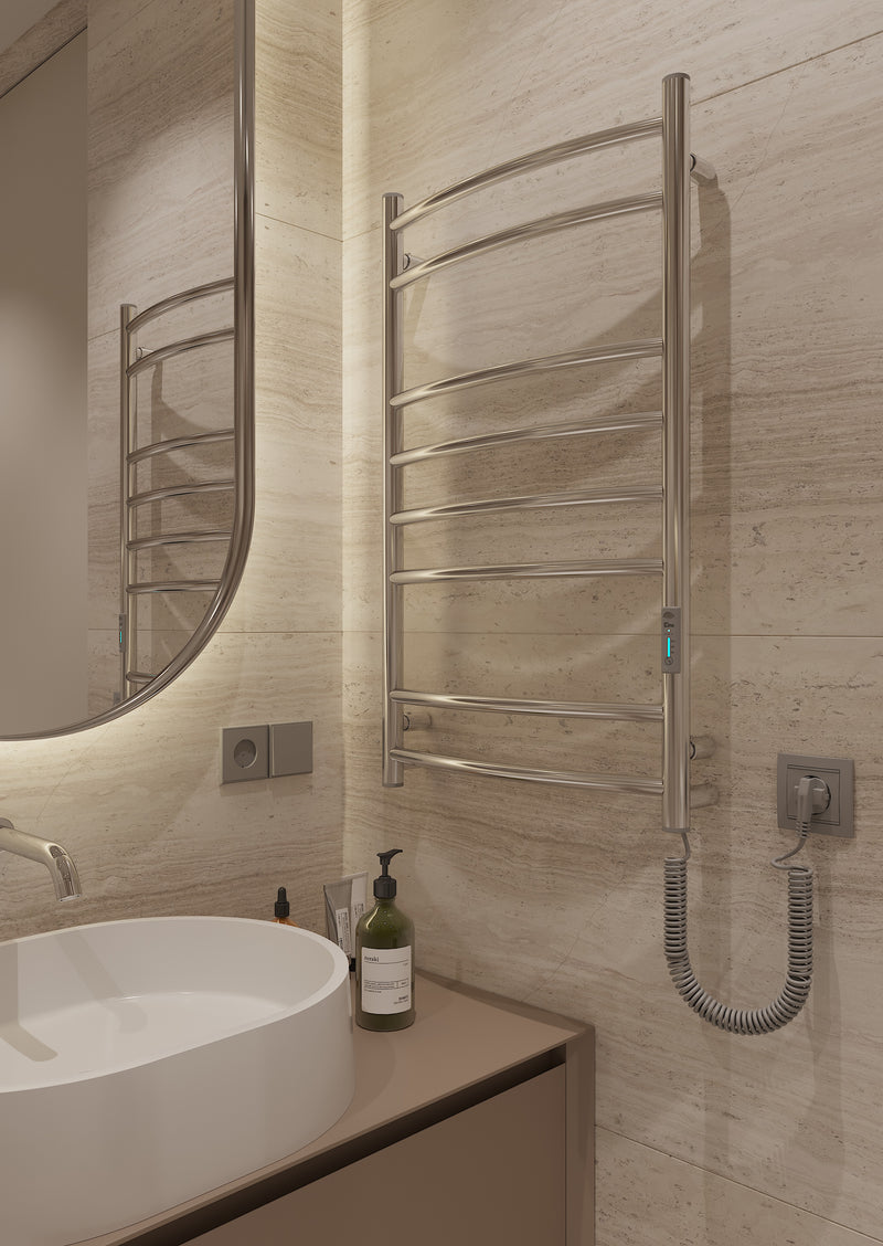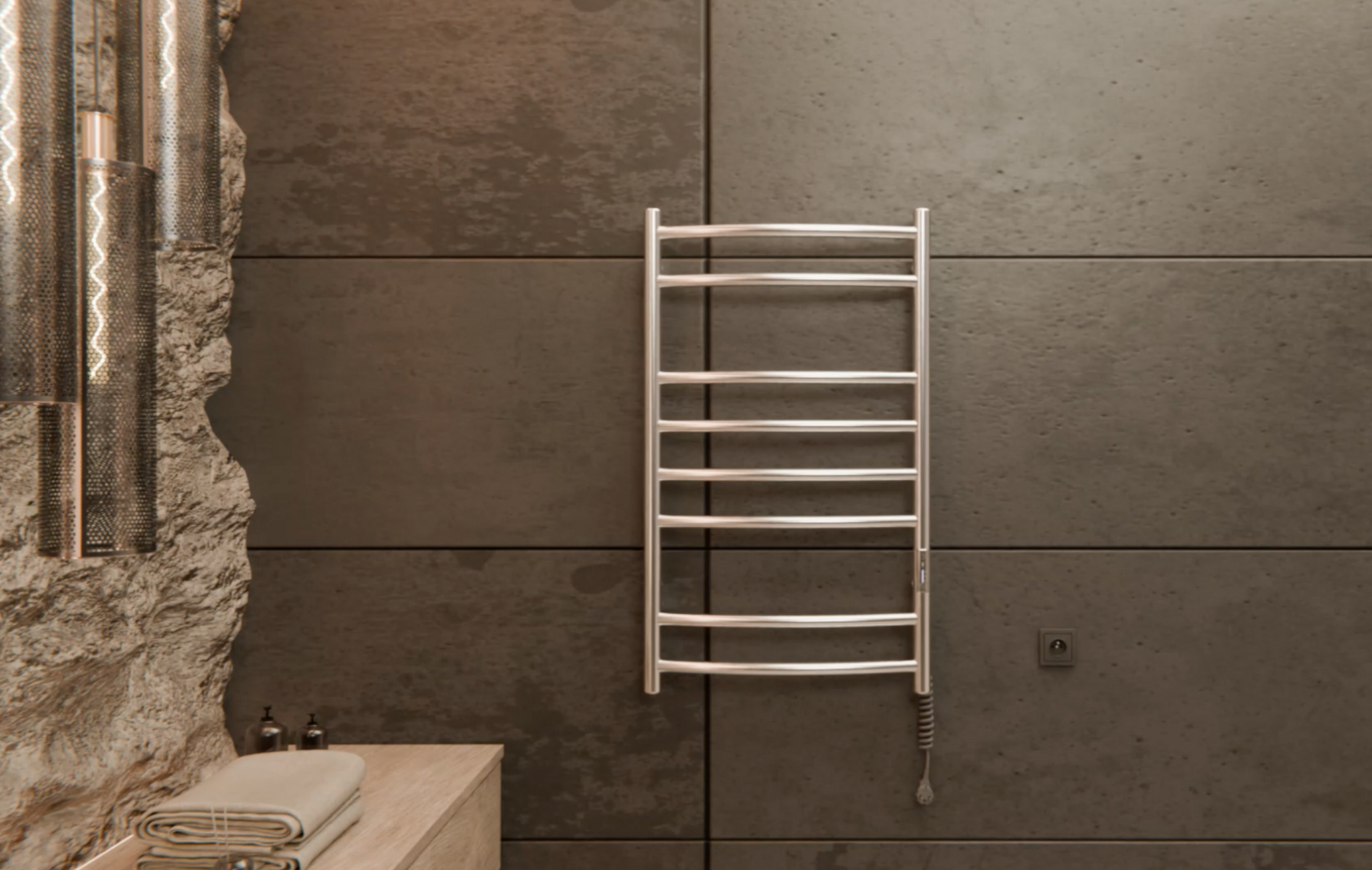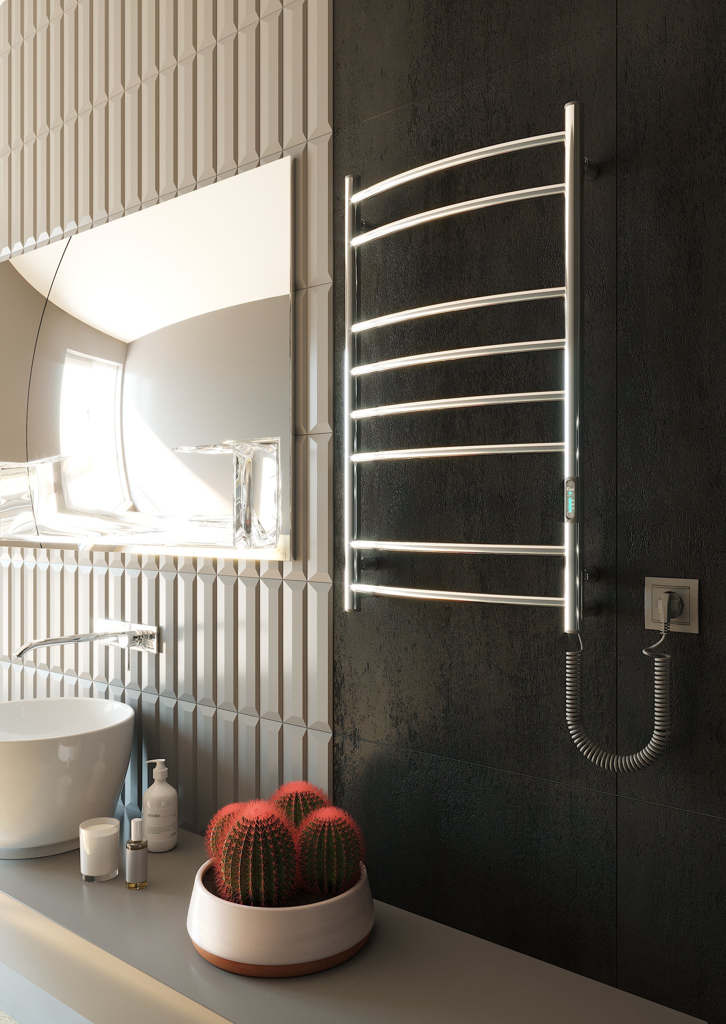 Siguiendo las tendencias mundiales en diseño de interiores de baños, le presentamos un radiador toallero eléctrico con acabado en acero pulido. Decisión de diseño perfecta para los clientes que están totalmente enamorados de los tonos fríos del cromo y las formas concisas del metal.