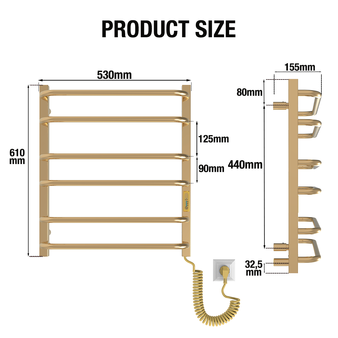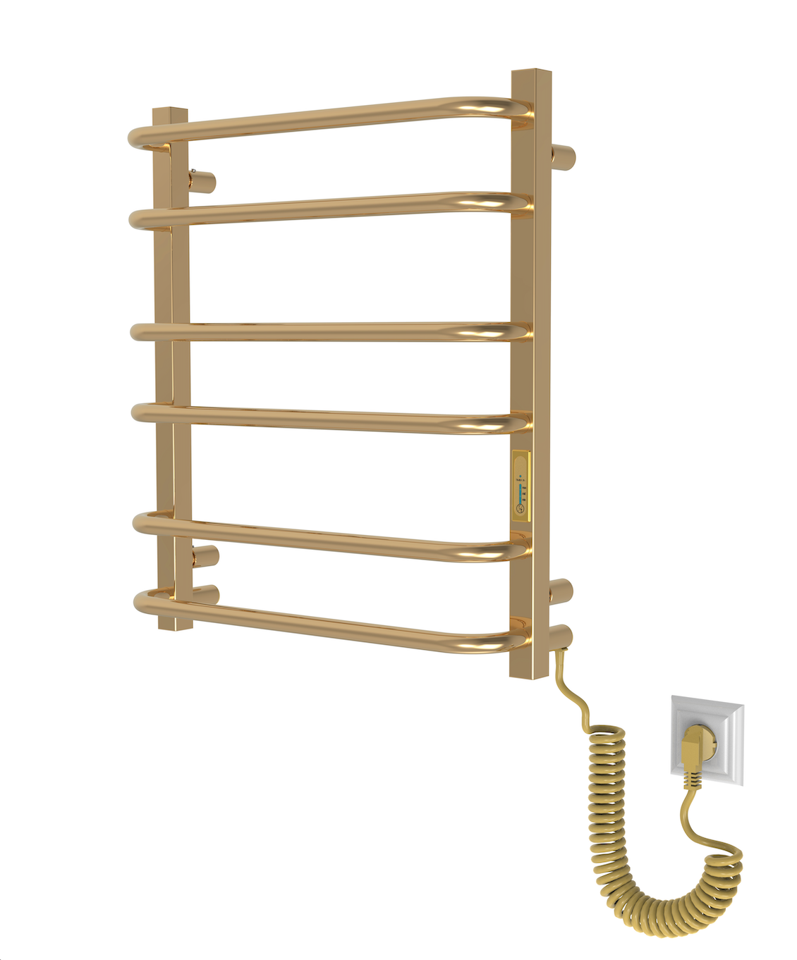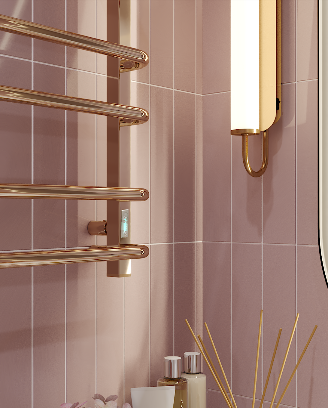 Siguiendo las tendencias mundiales en diseño de interiores de baños, le presentamos el toallero eléctrico con acabado en dorado pulido con efecto espejo. Decisión de diseño perfecta para clientes que están totalmente enamorados de los tonos cálidos del dorado y las formas concisas del metal. El toallero está hecho de acero inoxidable y mediante el uso del método de vacío PVD. Las cualidades funcionales y estéticas de un recubrimiento de nitruro de titanio del toallero son duraderas durante varias décadas.