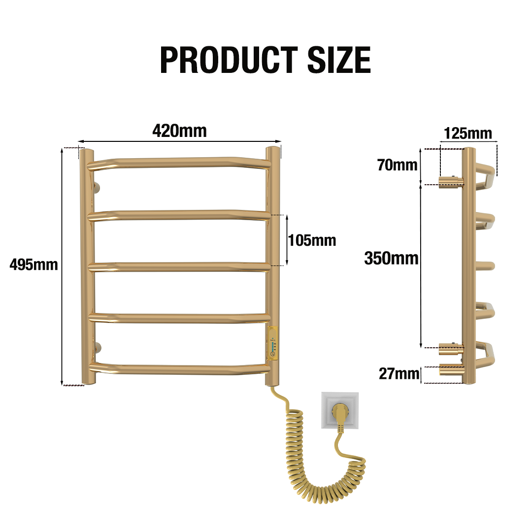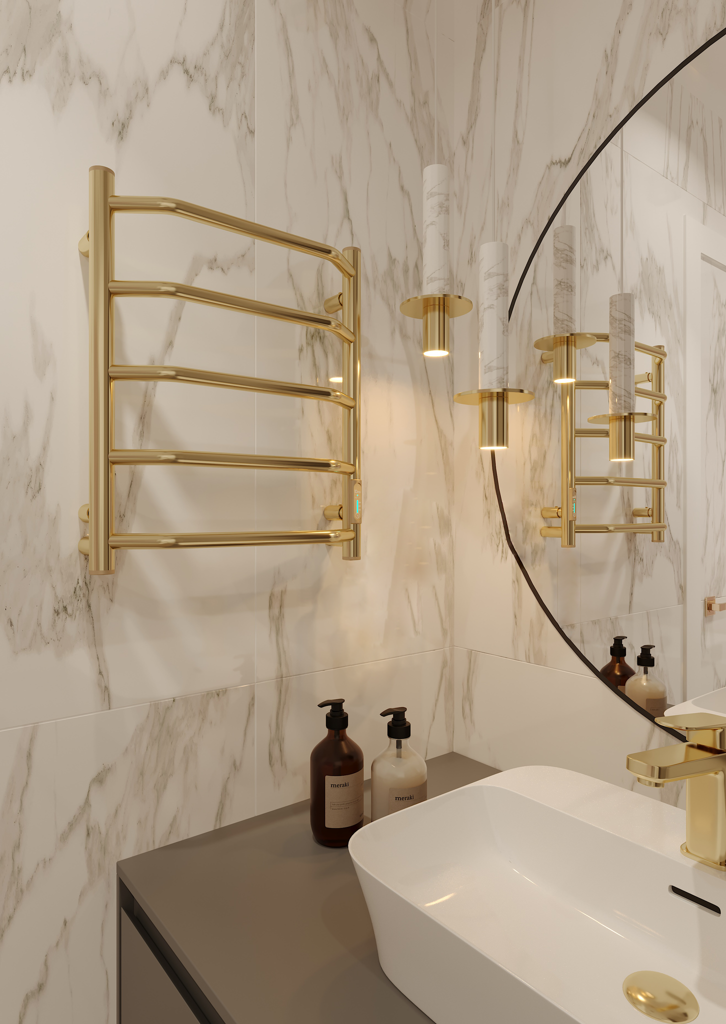 Siguiendo las tendencias mundiales en diseño de interiores de baños, le presentamos el mini toallero eléctrico con acabado en dorado pulido con efecto espejo. Una decisión de diseño perfecta para los clientes totalmente enamorados de los cálidos tonos dorados y las formas concisas del metal. El toallero está fabricado en acero inoxidable y mediante el método de vacío PVD. Las cualidades funcionales y estéticas del revestimiento de nitruro de titanio del toallero son duraderas durante varias décadas.