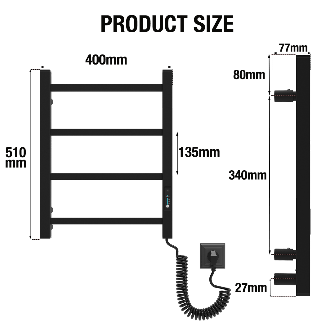Este toallero eléctrico está diseñado para la comodidad y la facilidad de uso. Se puede conectar en cualquier lugar con acceso a la electricidad. Con un sistema de cable interno seco, no requiere fluidos adicionales; simplemente conéctelo y estará listo para funcionar. El dispositivo se calienta rápidamente, alcanzando su temperatura máxima en cuestión de minutos.
