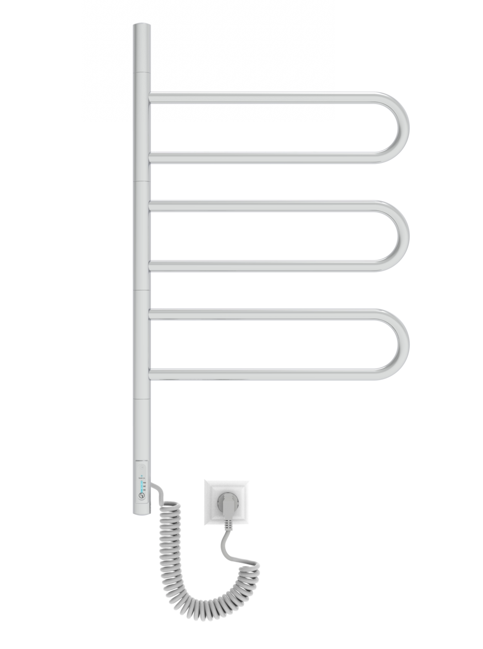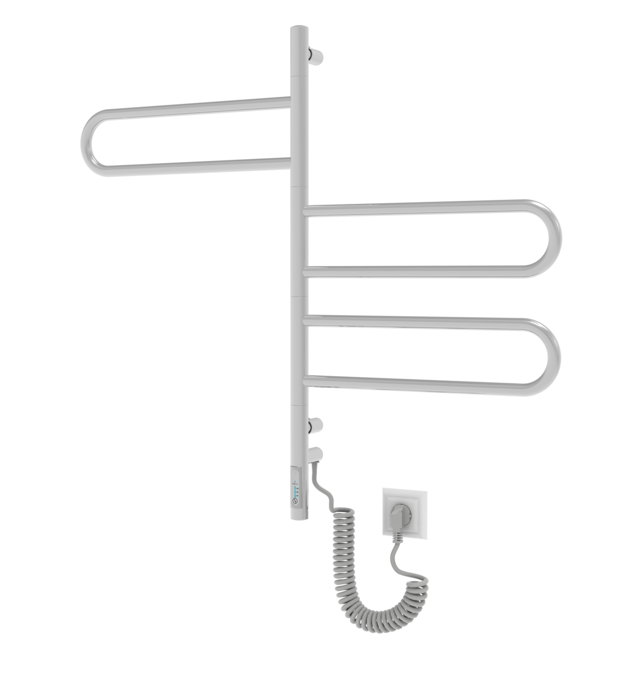 Este toallero eléctrico de baño con acabado en cromo presenta tres barras giratorias, cada una de las cuales puede rotar 180° independientemente de las otras. Una decisión de diseño perfecta para los clientes totalmente enamorados de los fríos tonos cromados con efecto espejo y las formas concisas del metal.