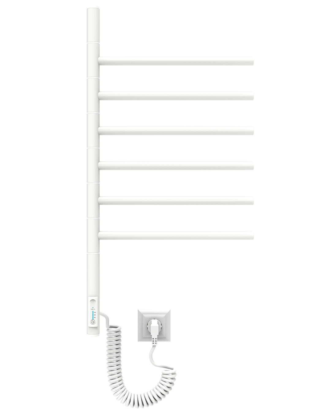 Este radiador toallero eléctrico para baño con acabado en blanco cuenta con seis barras giratorias, cada una de las cuales puede girar 180° independientemente de las otras. Decisión de diseño perfecta para clientes que están totalmente enamorados de los colores clásicos y las formas concisas del metal.