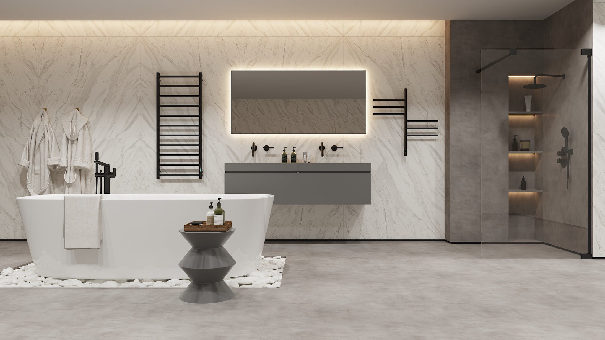 Este radiador toallero eléctrico para baño con acabado en negro mate cuenta con seis barras giratorias, cada una de las cuales puede girar 180° independientemente de las otras. Decisión de diseño perfecta para clientes que están totalmente enamorados de los colores industriales y las formas concisas del metal.