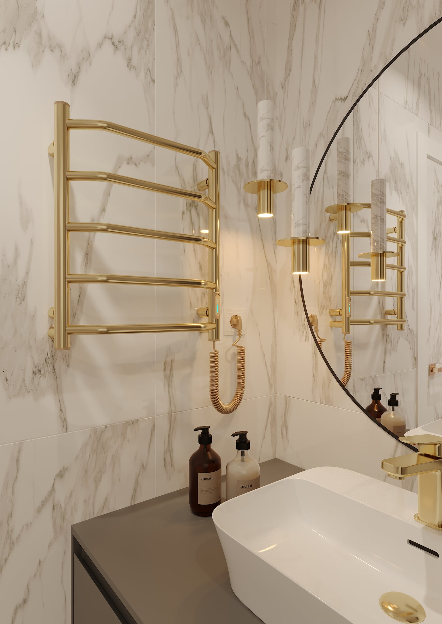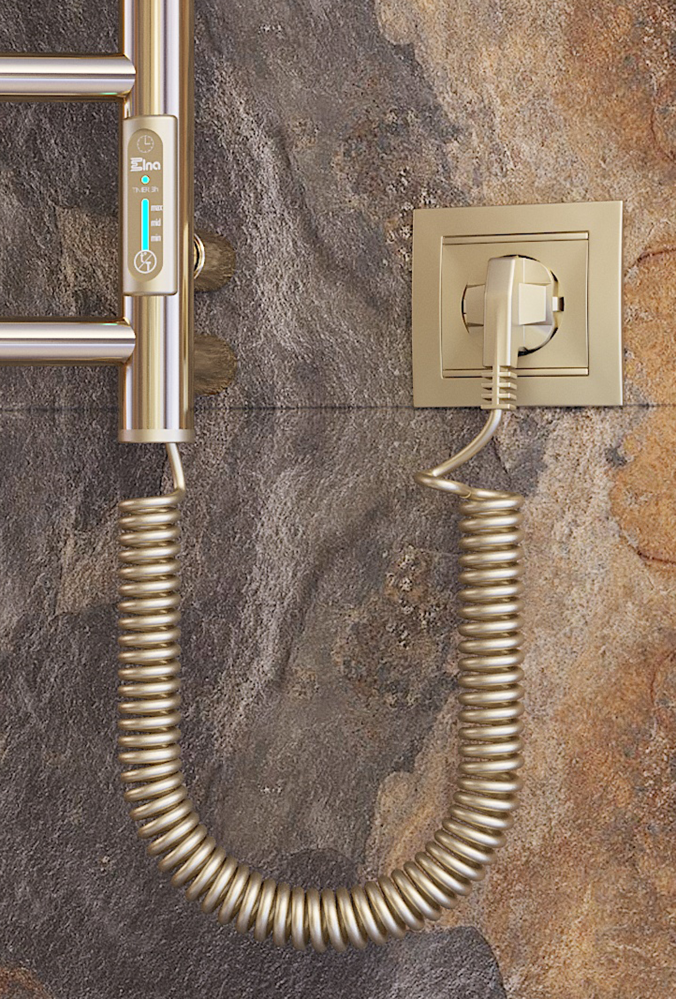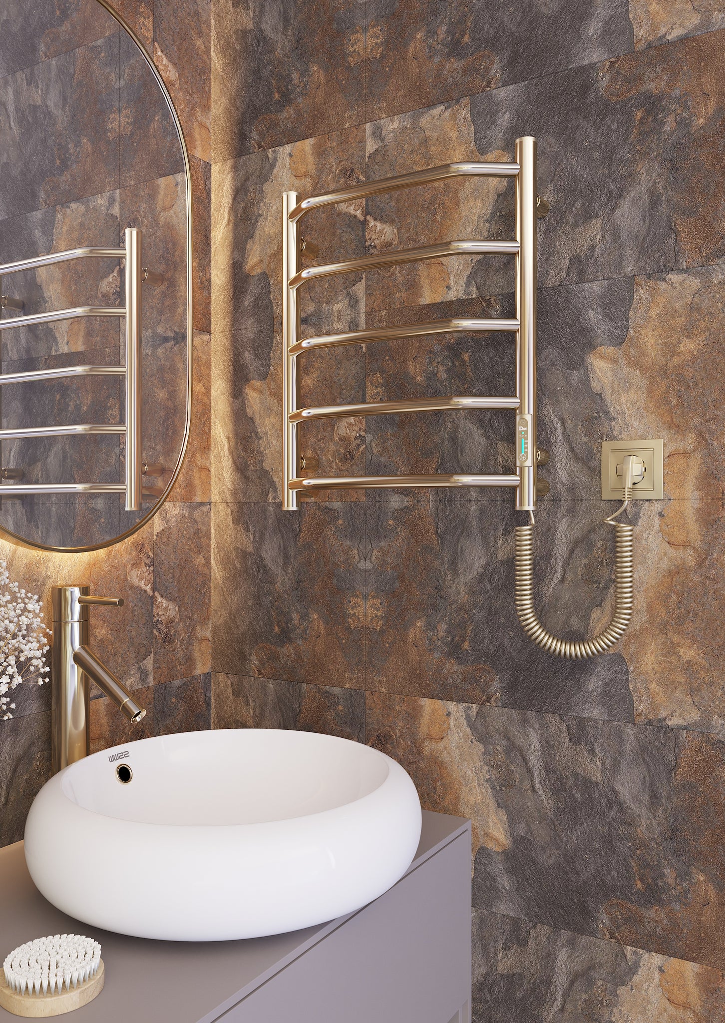 Siguiendo las tendencias mundiales en diseño de interiores de baños, le presentamos el mini toallero eléctrico con acabado en oro pulido con efecto espejo. Una decisión de diseño perfecta para los clientes totalmente enamorados de los cálidos tonos dorados y las formas concisas del metal. El toallero está fabricado en acero inoxidable y mediante el método de vacío PVD. Las cualidades funcionales y estéticas del revestimiento de nitruro de titanio del toallero son duraderas durante varias décadas.
