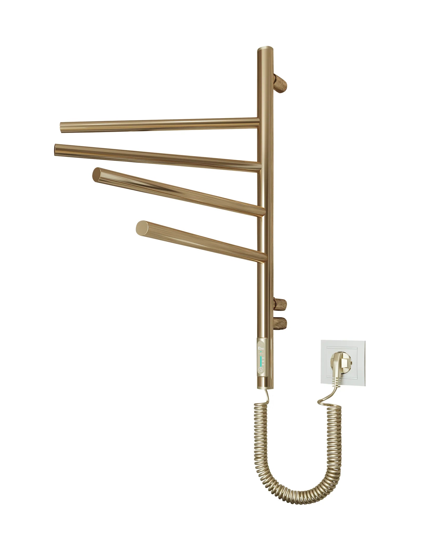 Este radiador toallero eléctrico para baño con acabado en oro pulido cuenta con cuatro barras giratorias, cada una de las cuales puede girar 180° independientemente de las otras. Este dispositivo eléctrico está hecho de acero inoxidable y mediante el uso del método de vacío PVD. Las cualidades funcionales y estéticas de un recubrimiento de nitruro de titanio son duraderas durante varias décadas. La superficie perfectamente espejada del dispositivo y su agradable tono oro aterciopelado enfatizarán la atmósfera lujosa del baño.